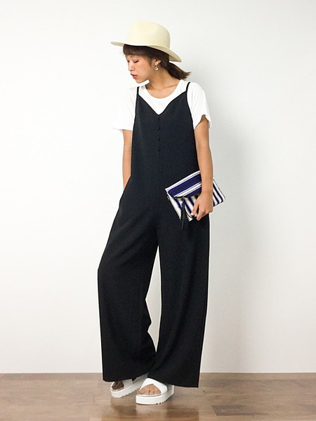 ゆったりシルエットのサロペット。ハットと合わせて 夏らしい大人モノトーンスタイル。