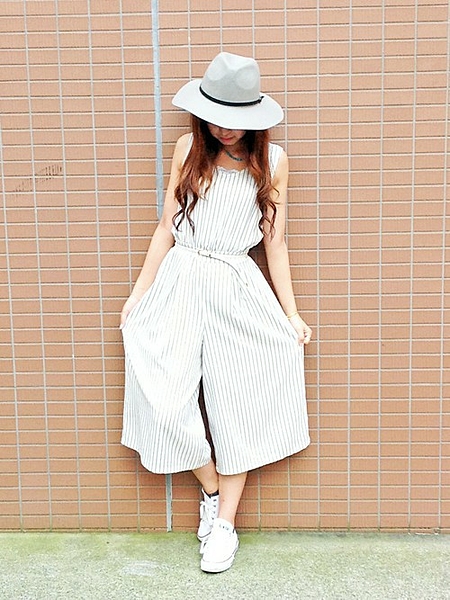 オールインワンのガウチョスタイル。ストライプで足長効果&スタイル抜群♡ 足元はスニーカーでこなれた感じに。