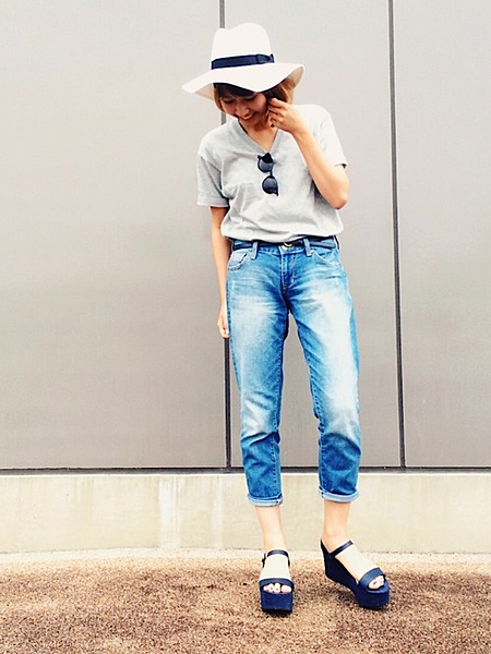 白シャツにデニムを合わせたシンプルスタイル。かっちりとしたつば広ハットがとってもクール大人カジュアルな夏コーデ。