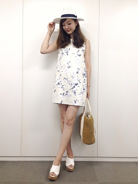 花柄ワンピースにハットで上品フェミニン。
