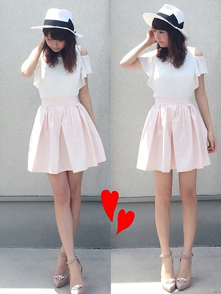 ホワイト×ピンクのガーリーコーデ。ちらりと見える肩とフリルが女の子っぽい♡