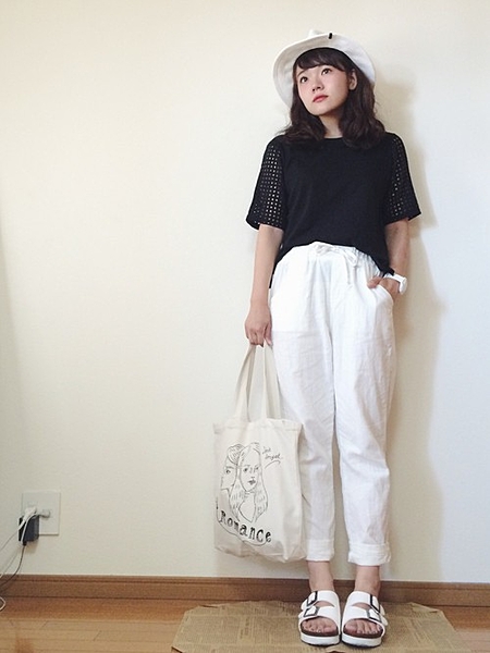 黒の割合を少なくすることで重くなりすぎない◎サンダルも時計もバッグも白で統一。