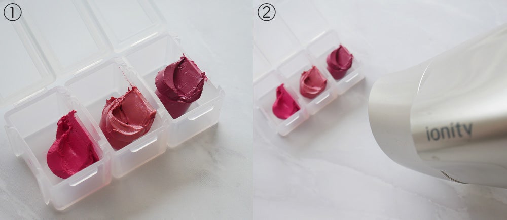 これもめちゃくちゃ簡単ですよ。割れたリップ&ヴァセリンをケースに入れて、ドライヤーで温めるだけ。分量は好みにもよると思いますが、私はリップ1に対してヴァセリン5くらい入れました。ただし、柔らかめのリップを使用する場合は、ヴァセリンは少なめでOK。不安な人はドライヤーで温めながら様子を見て、量を調節するように…!