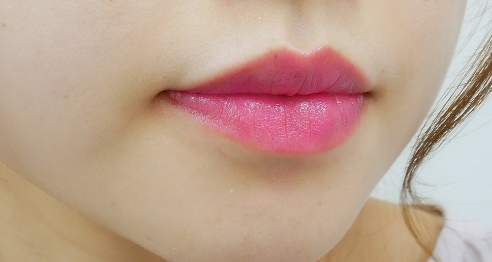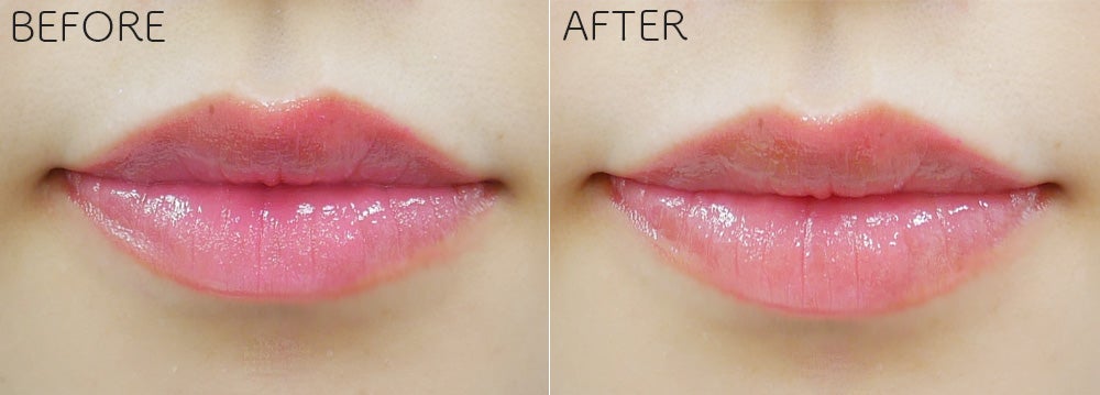 塗ってみるとこんな感じ。ふわっと軽い着け心地で、本物のリップのよう!ヴァセリンのおかげで潤いの持続効果も抜群です。唇を自然にボリューミーに見せてくれますよ。ヴァセリンの量を多めにすることで、グロスっぽいツヤのあるリップにすることもできるのだそう!