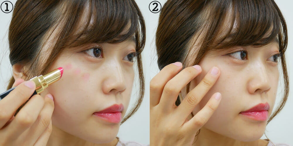 1つ目はチークとして再利用する方法です。この場合は、程よいツヤ感×派手すぎない色味のリップがおすすめ。頬に使う前に手の甲などで試し、「馴染みはいいか」「塗りムラはできないか」などチェックしておくといいかも。