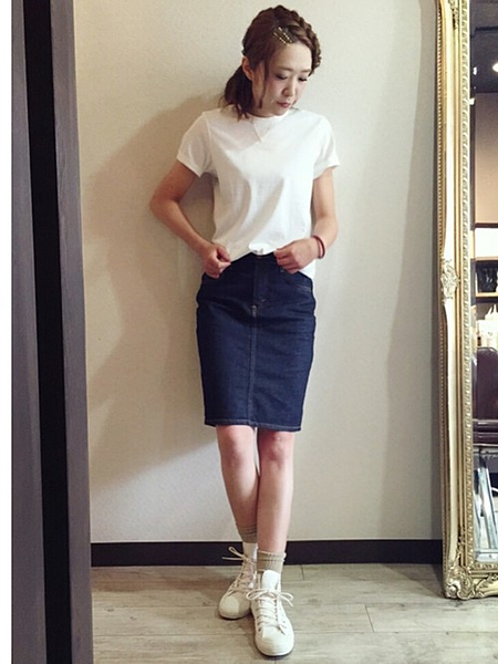 ゆったりめの白ティーにデニムのタイトスカートでシンプルに女っぽくてかわいい