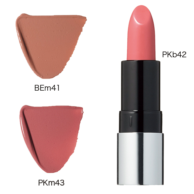 なめらかにのび、シアーで光沢感のある仕上がりをかなえる。PKb42は健康的なコーラルピンク、BEm41はナチュラルな王道ベージュ。