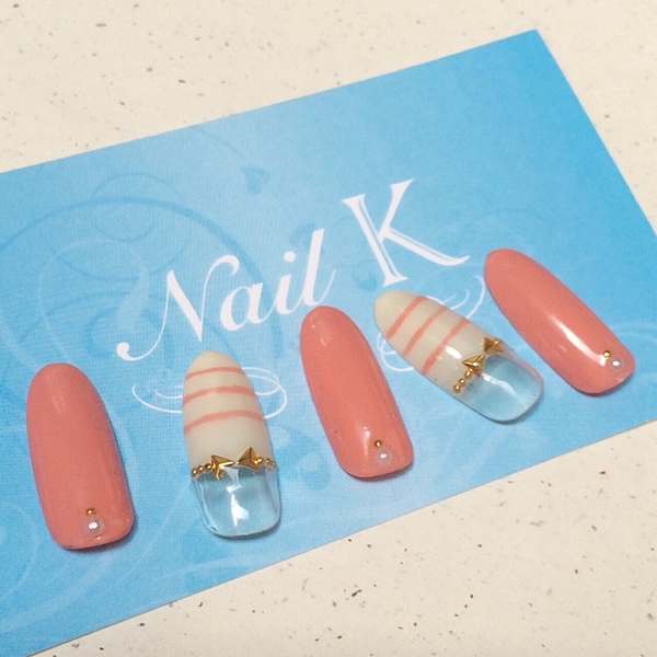 ピンク系とホワイトのガーリーカラーでまとめた、ランダムボーダーネイル