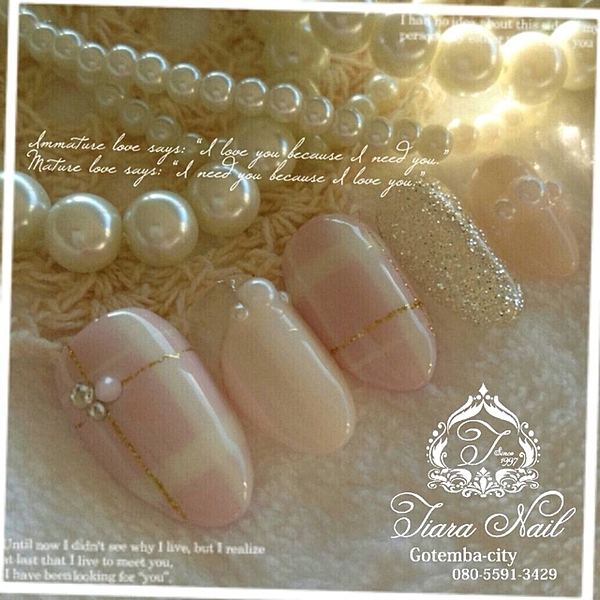 ラメと小さめパールを根元に並べて、上品に仕上げて・・