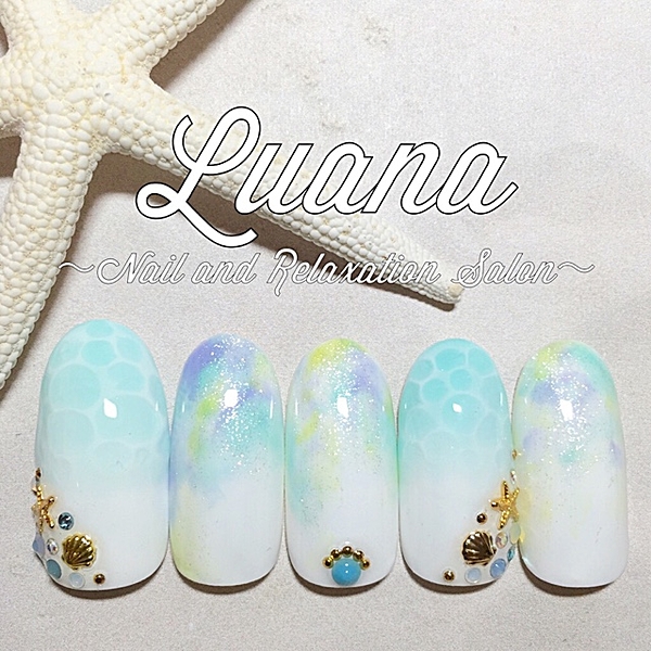 ゴールドシェルネイル コーラルピンクのグラデにゴールドシェル、オパール系ストーンをのせた大人可愛い夏ネイル http://t.co/jcYlL3ggTO