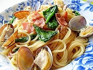 楽天レシピ:「アサリと菜の花とベーコンの春パスタ 」より
