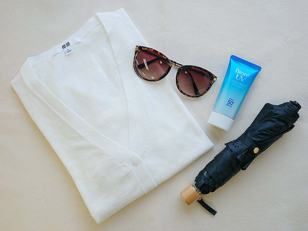 まずは白肌さんが毎日持ち歩いているもの!それは、「薄手の長袖カーディガン」「サングラス」「日焼け止め」「日傘」の4つです。1つずつ選び方のポイントを紹介していきますね。