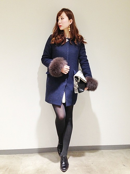 ノーカラーファーコートはボタンを閉めて、