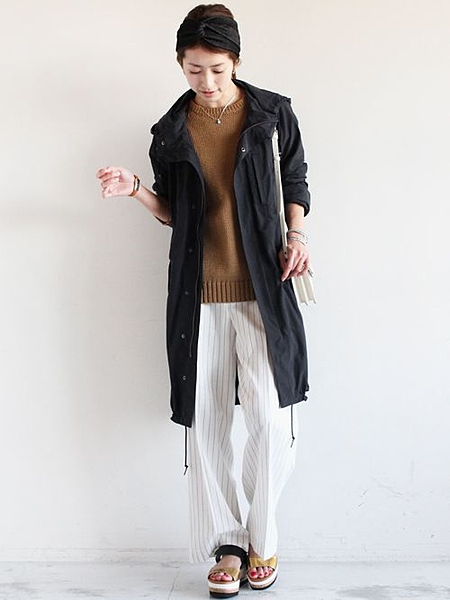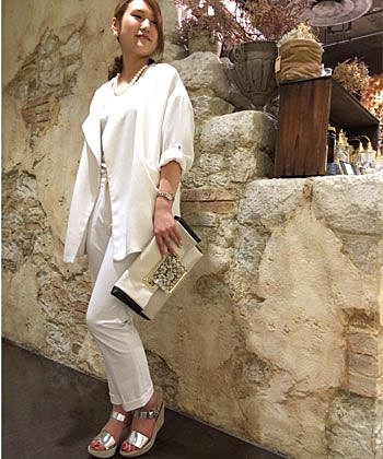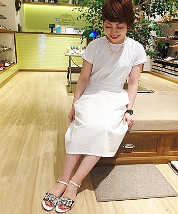 ヒールが苦痛でなければ、ウエッジソールのメタリックサンダルもオススメ。ミモレ丈スカートなどに合わせて爽やか上品に着こなすのがトレンド。