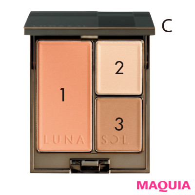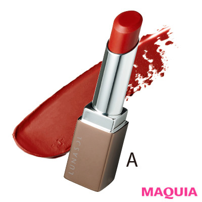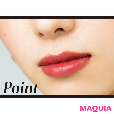 クールな顔立ちなので、赤リップを取り入れると和顔になりかねない。そこで、選ぶ色みをブラウンベースにして肌へのなじみ度を高めるのがポイント。さらに、シェーディングやハイライト、眉を太めに描いてメリハリを与えるのがコツ。顔立ち特有のシャープさが引き立って、洗練された美女印象に。