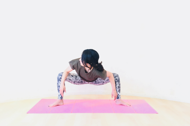 (1)両脚を肩幅の2.5倍以上広く左右に開いて立ちます。