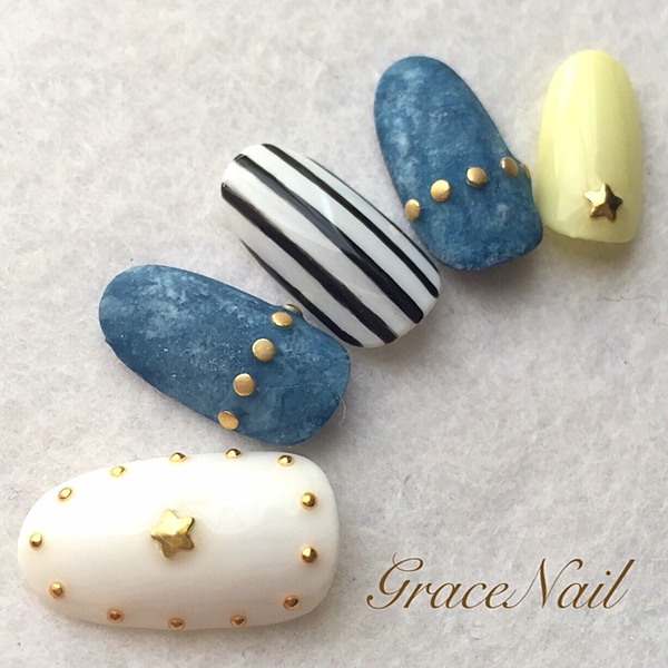 2・3色でまとめられたデニムネイルがお似合い。