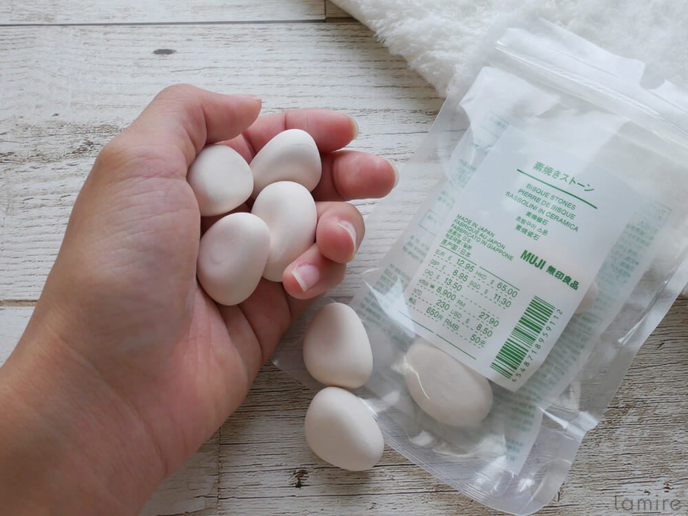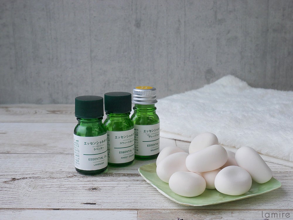「湯船に直接入れるのは抵抗がある」という人は、同じく無印で販売している「素焼きストーン」を活用しましょう。エッセンシャルオイルを染み込ませることで、ほんのりとした香りが浴室中に広がります。「少量のオイルでもよく香る」とアロマ好きの間で密かに人気の商品なんです。