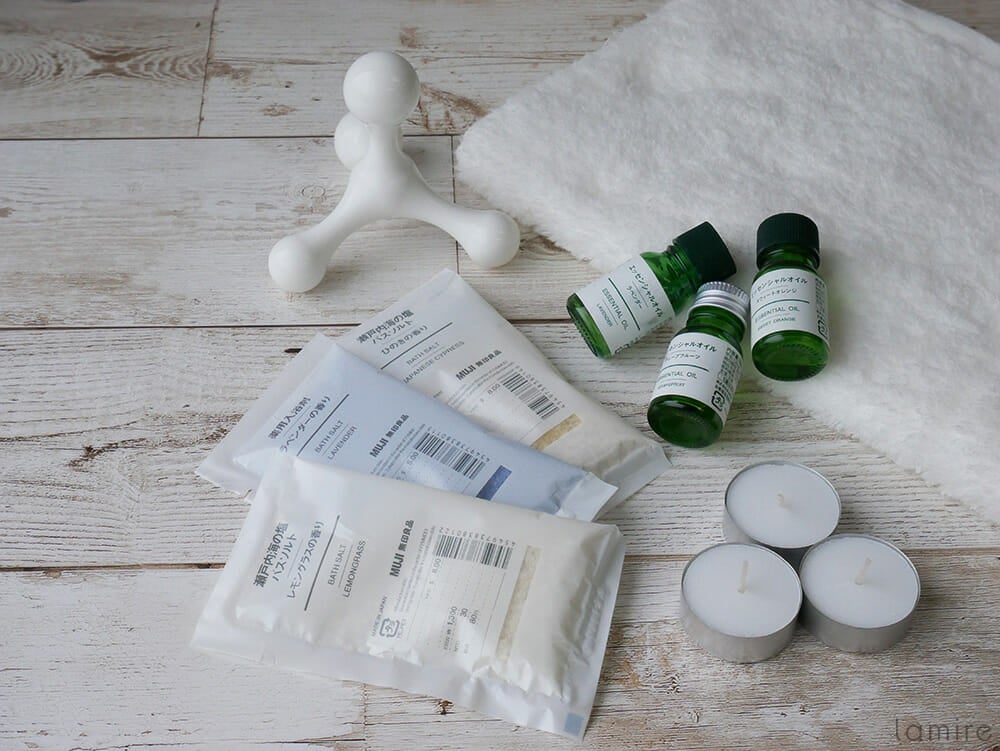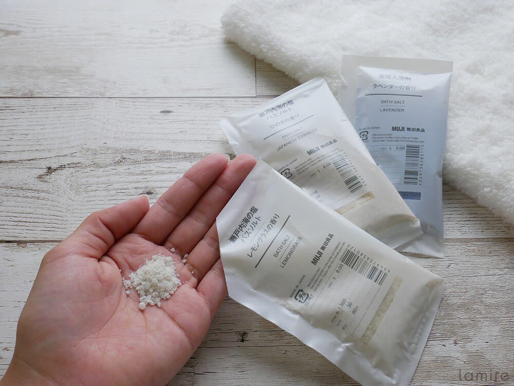 その日の気分に合わせて、入浴剤やバスソルトを変えたら…?きっと毎日のお風呂がもっと楽しみになるはずですよ。無印なら1つ50円〜購入することができるんです。