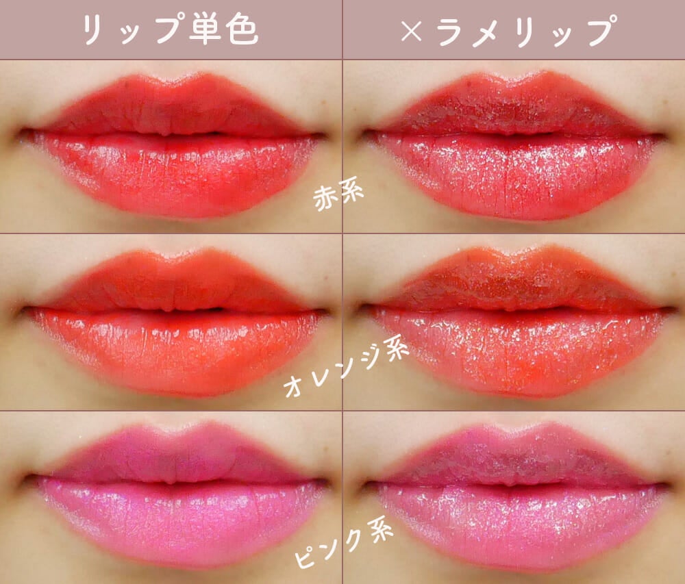 赤・オレンジ・ピンクの定番カラーも、ラメをプラスすることでグッと華やかな雰囲気に。仕事用の地味めなリップも、ラメを重ねれば特別感をプラスできます。他のパーツを控えめに仕上げれば、全体のバランスもバッチリ♡