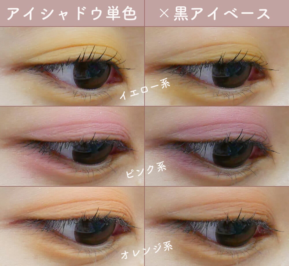 色の変化がわかるように、パキッとした発色のアイシャドウに重ねてみました。アイシャドウ単色だとちょっぴり派手すぎるカラーも、ブラックを重ねることで秋らしいくすみ色に。黒のアイベースさえゲットすれば、春・夏のコスメも秋っぽくアップデートできちゃうんですよ。