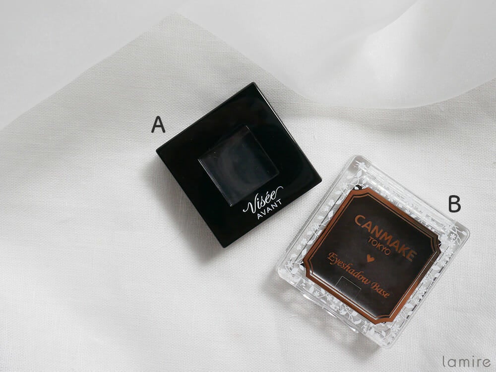 Aは黒のクリームアイシャドウなのですが、透けるような質感が特徴なので重ねて使うのにピッタリ。Bは上に重ねるアイシャドウの色をスモーキーにチェンジしてくれるアイテム。