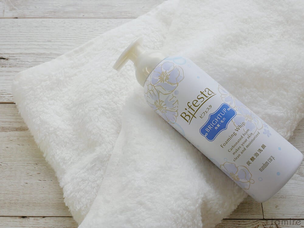 2〜3分ほど蒸しタオルをあてたら、洗顔料をしっかりと泡立て入念に顔を洗います。泡立てネットを使って、できるだけキメ細かい泡を作りましょう!