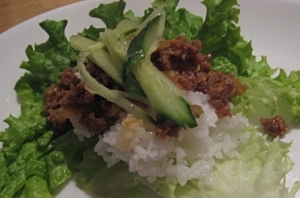 甘辛のたれで炒めた肉味噌ときゅうりをのせて・・