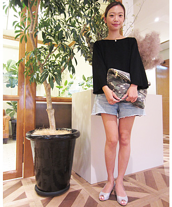 オーバーオールタイプのシーパンは、女の子らしいブラウスに足元はヒールを合わせて大人きれいな着こなしに。