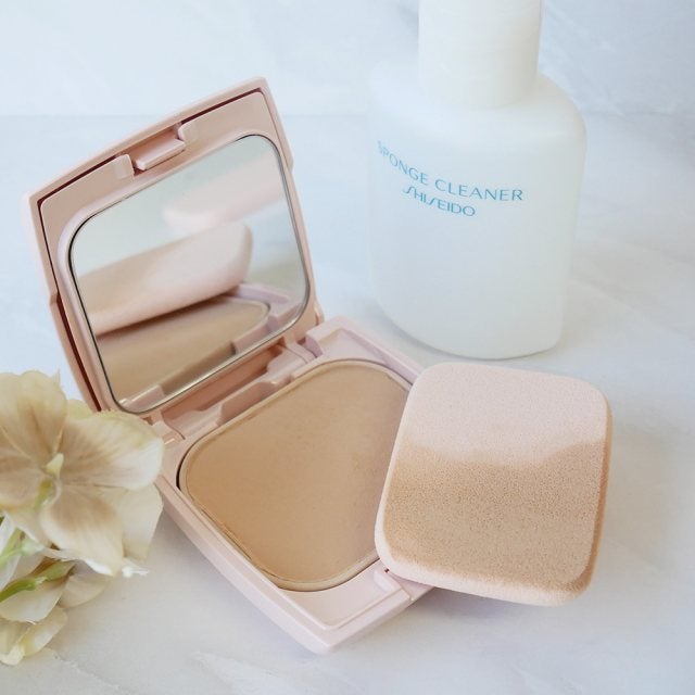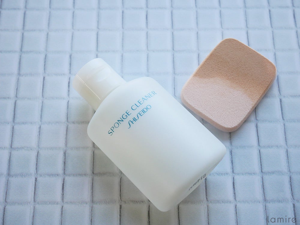 洗う際に必要なのは、スポンジと専用クリーナーだけ。今回使用するものは資生堂のものですが、最近ではダイソーやセリアなどの100円ショップでも手軽に購入することができますよ。スポンジの汚れにもよりますが、1回に使う量はほんのごくわずかなので、これ1本で半年ほどは持ちます。