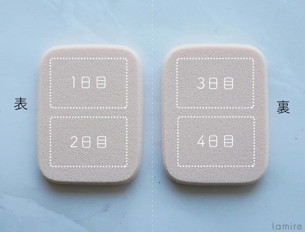 では、スポンジを洗う頻度は?理想は表裏片面ずつ使用して、4日ごとに洗うのが◎特に肌が弱い人は、一度使った面は使用しないようにするのがおすすめです。特に肌悩みがないという人でも、1週間に1度は洗う習慣をつけましょう。