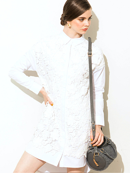 高密度でハリ感のあるシャツ地に、クラシカルなレースを大胆にレイヤードさせた贅沢なレースシャツワンピース。