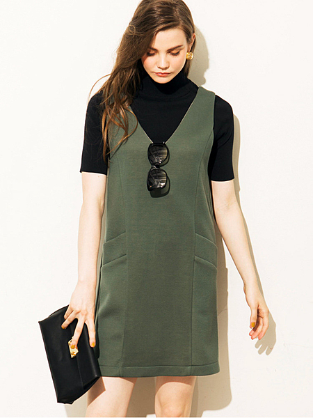 Vネックワンピースをレイヤード。