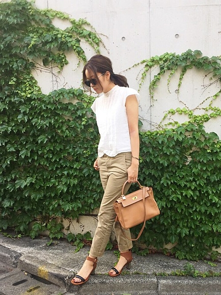 夏シンプルスタイルを一気に秋っぽく格上げしてくれるのが、ブラウンカラーの小物たち。