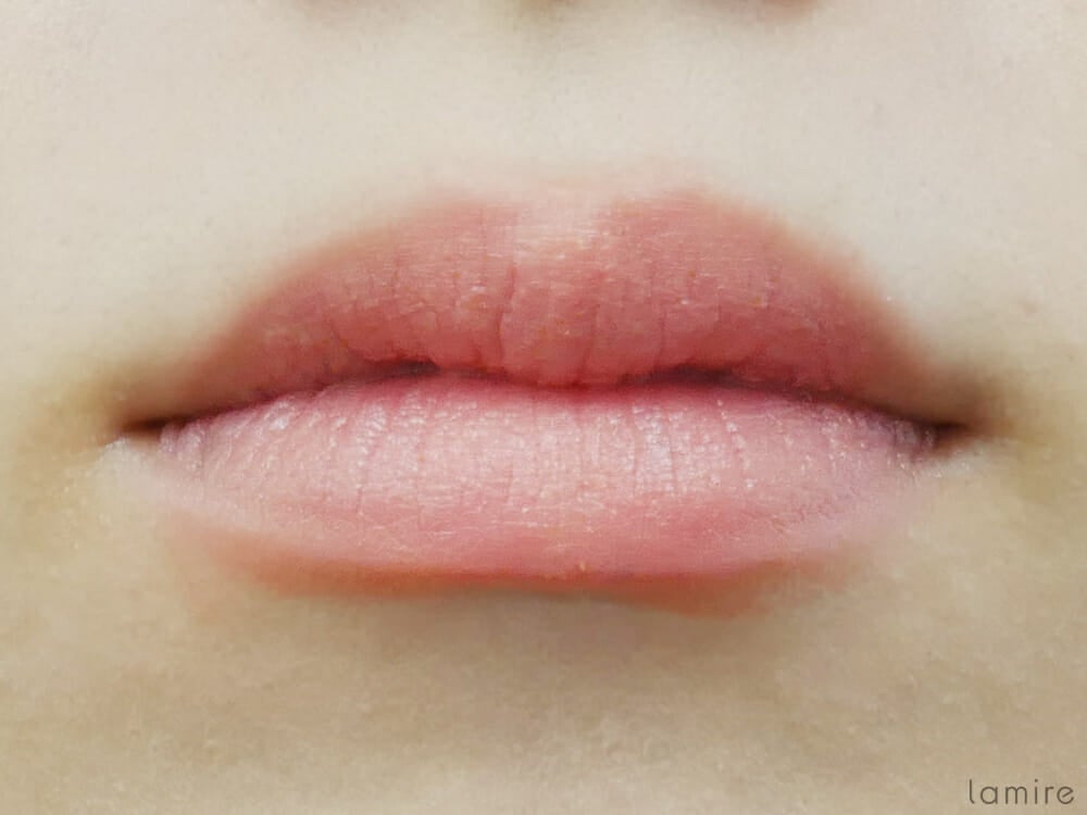軽く指にとって塗ってみると…あまりの軽さにびっくり!スッと素早く馴染んで、まるで元からの血色感のような仕上がりになりました。色素は果物から抽出したビタミン・ミネラルたっぷりのフルーツ成分を使用しいているので、こころなしか唇もジューシーに見えてきます♪