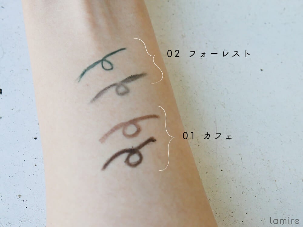 まろやかな色味の「カフェ」と深みのある「フォーレスト」。どちらもはっきりとした色味で発色もとてもいいんです!また、濃い色を上のラインに、薄い色を下のラインに引くとおしゃれでおすすめ。