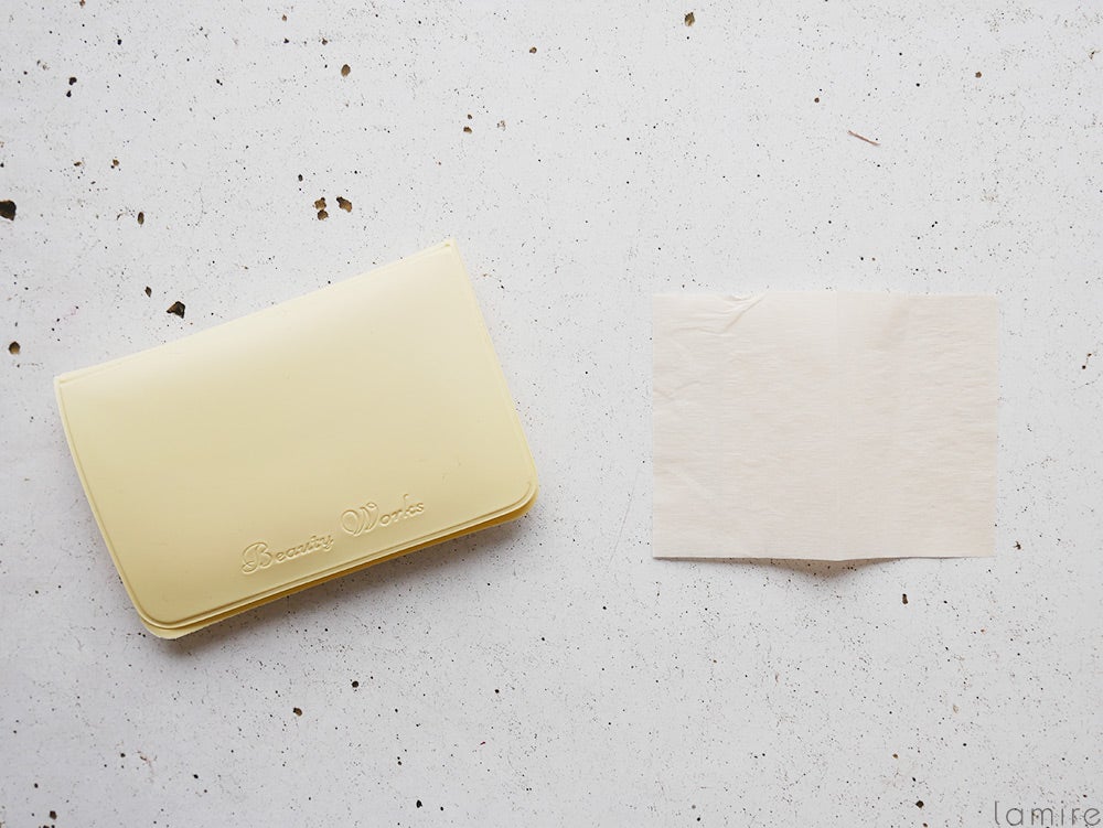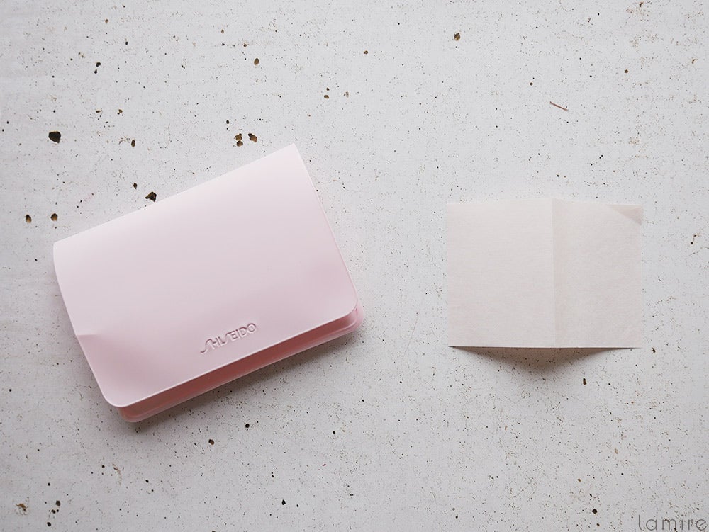 紙おしろいは、あぶらとり紙とフェイスパウダーが一体になったもの。あぶらとり紙の表面にフェイスパウダーが塗ってあるので、テカリを抑えながらメイク直しもできちゃうんです!基本的には片面だけにパウダーがついているので、肌にそっと押し当てればOK。