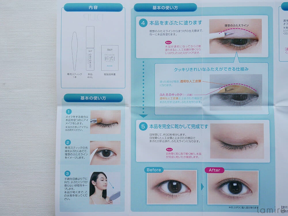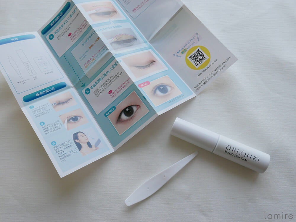 では、折り込み式とは一体どういうものなのか?説明書きによると、まぶたに透明の人口皮膜を作り、それが内側にグッと折り込まれることで二重の線ができるそう!これだけ聞くと何やら難しそうですが、通常の二重コスメと違い無理やり押し込むわけではないので、仕上がりもすごくナチュラルなのだとか。