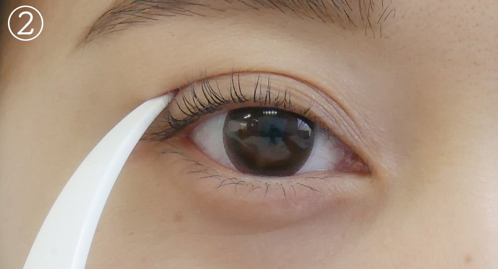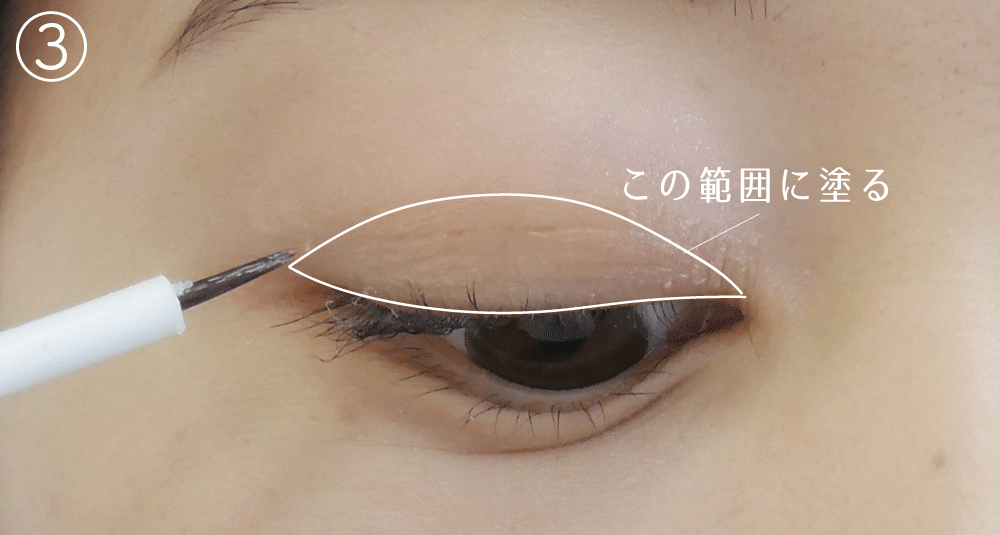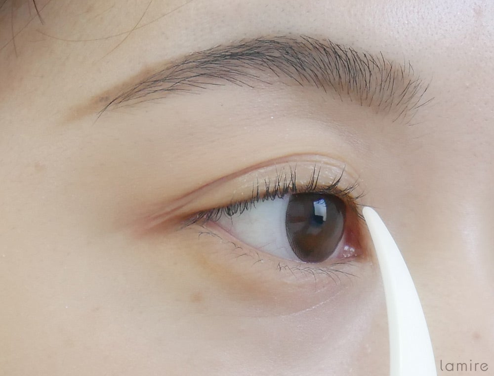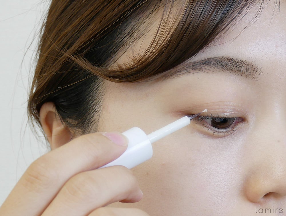 ここまできたら、あとは液を塗るだけ。先ほどイメージした二重ラインの内側に均一に塗っていきます。塗る範囲はラインの内側からまつげの生え際まで!目線をやや下にして、まぶたにシワが寄らない状態をキープしましょう。
