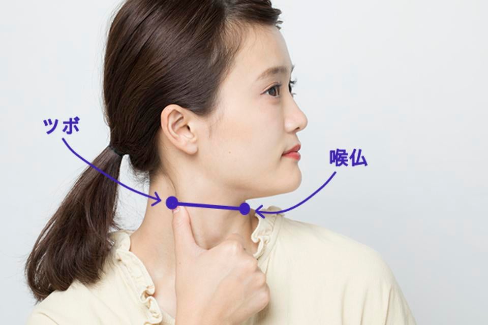 喉ぼとけから水平に線を引いた部分にツボがあります。浮き出た筋肉の背中側です。