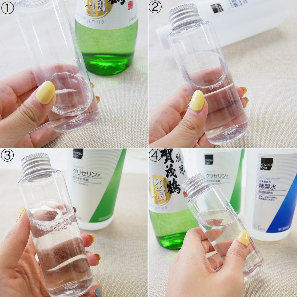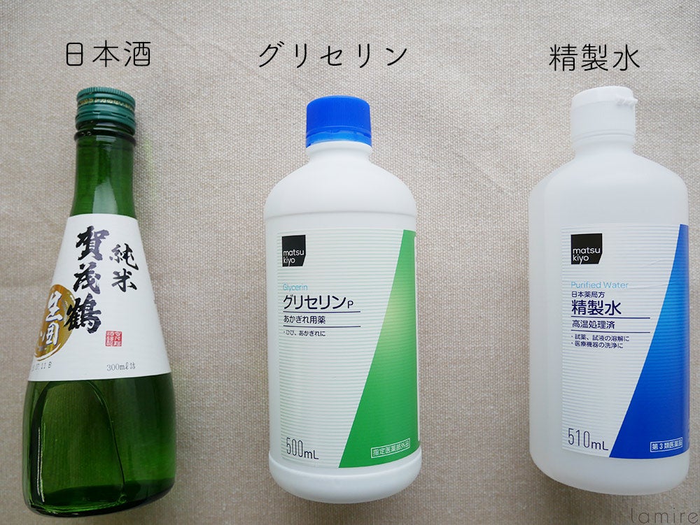 日本酒化粧水は、日本酒・グリセリン・精製水の3つの材料を使います。日本酒は、純米酒を使うと純度が高いので安心です。グリセリンはヒアルロン酸で代用することもできますよ。