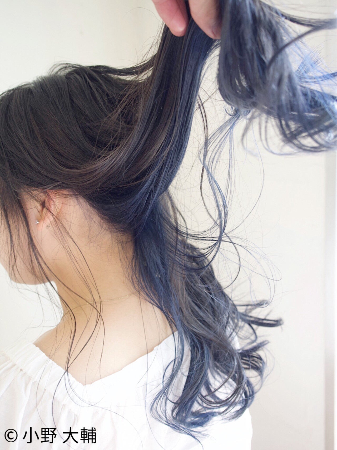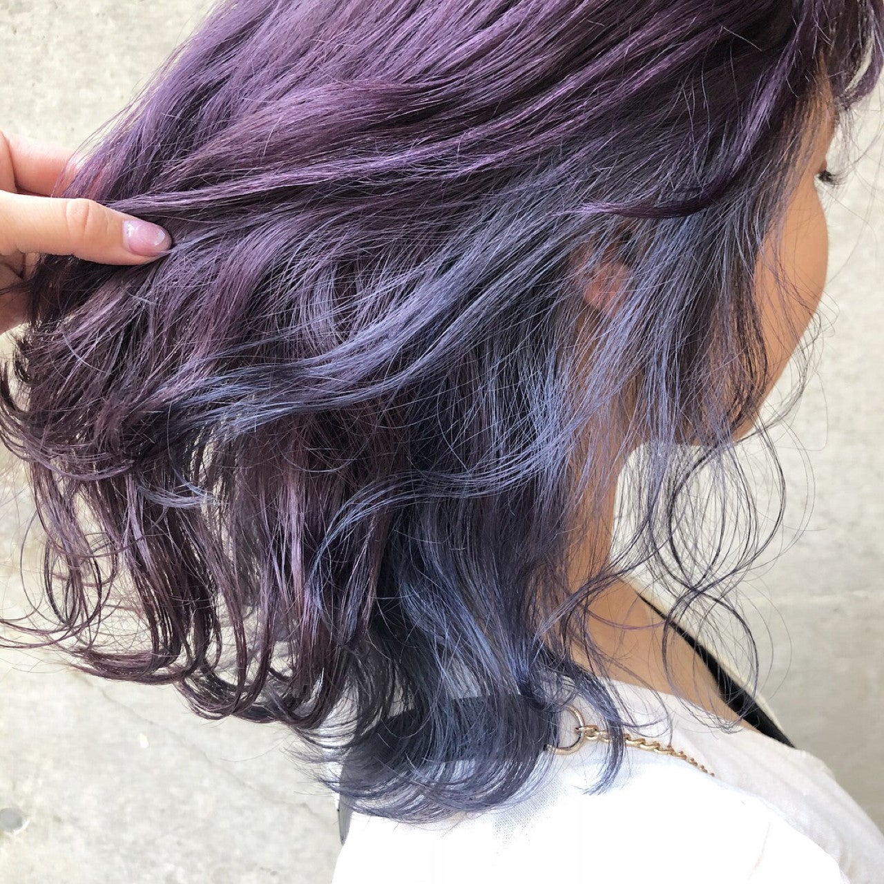 ブルー系のヘアスタイルを楽しむならインナーは紫に。色落ちしてもキレイなカラーです。