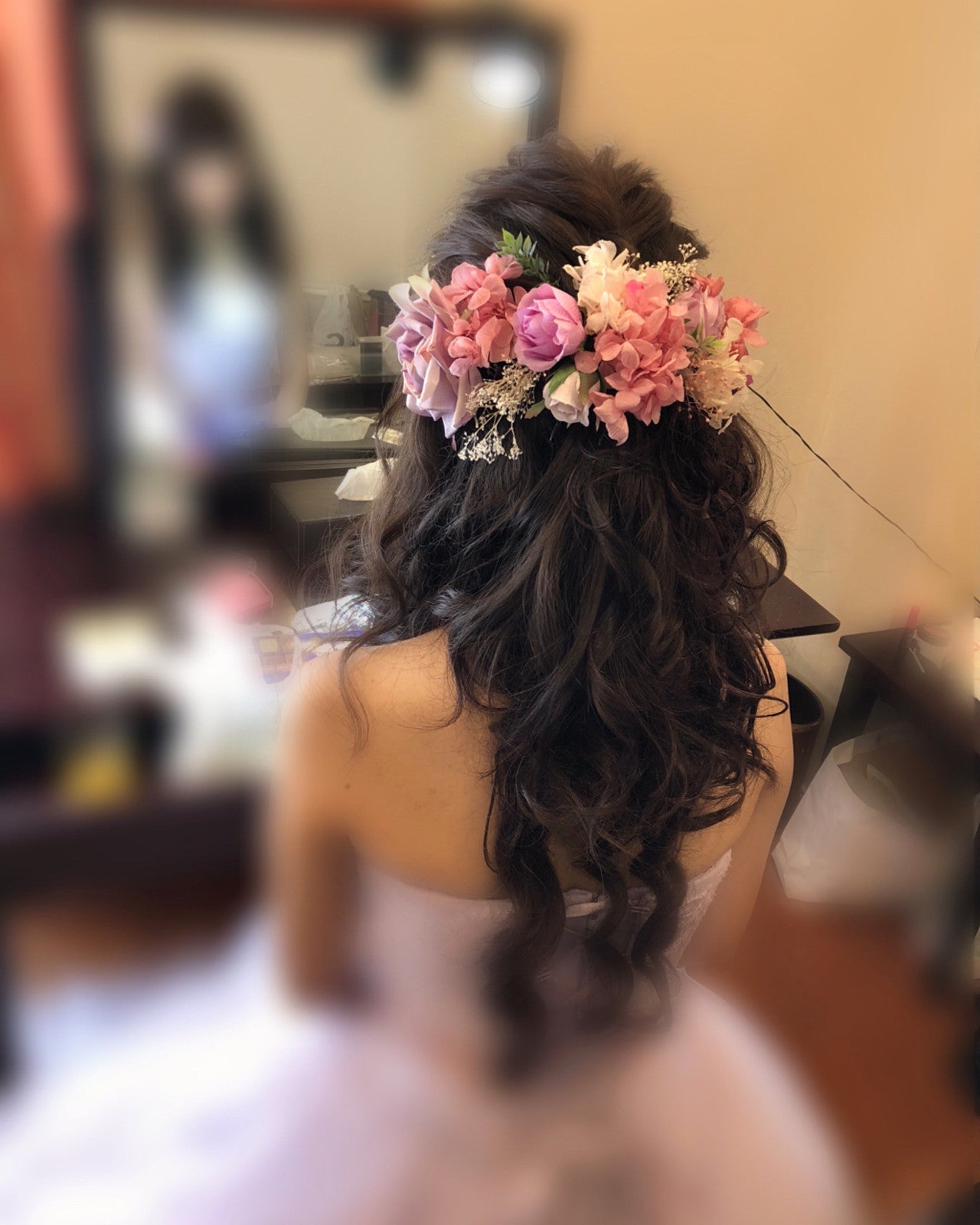 ふわふわのハーフアップに色とりどりのお花をアレンジしています。花嫁さんにおすすめですよ。
