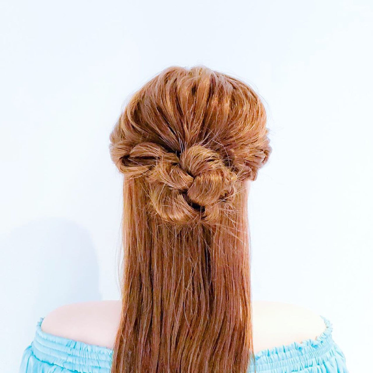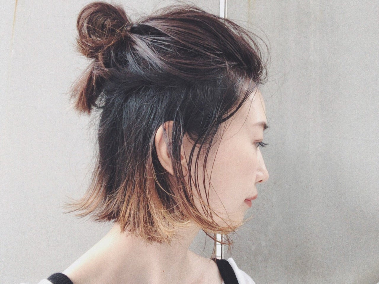 トップで小さめのお団子をつくるカジュアルなハーフアップです。お団子はふんわり小さくつくることでこなれ感を演出。