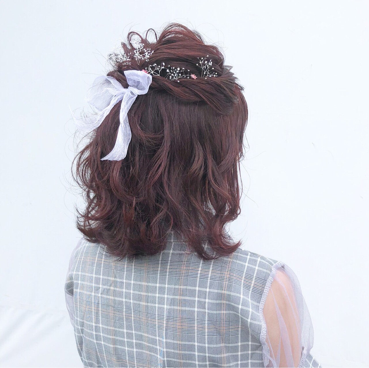 リボンとお花を組み合わせた華やかなハーフアップ。リボンの大きさや色、お花の種類を変えるだけで、雰囲気も簡単に変えられる便利なアレンジです。