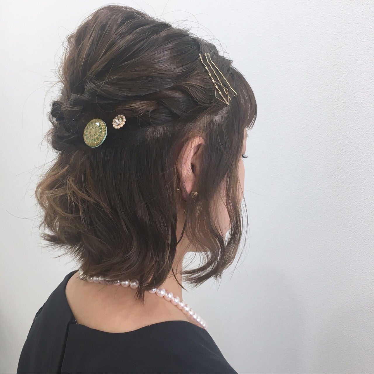 リボンと大きなパールをあしらったパーティー仕様のハーフアップです。リボンはあえて小さめにすることで品の良さを演出しています。