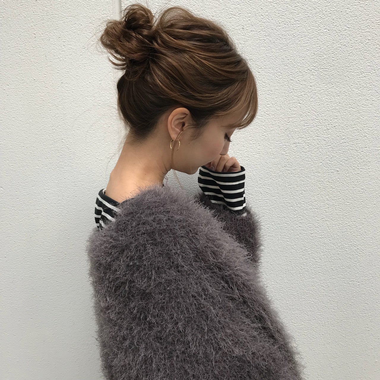 髪をまとめて後ろにお団子をつくりましょう!トップとお団子を少し崩せは今っぽさのあるナチュラルなアレンジが完成します♪