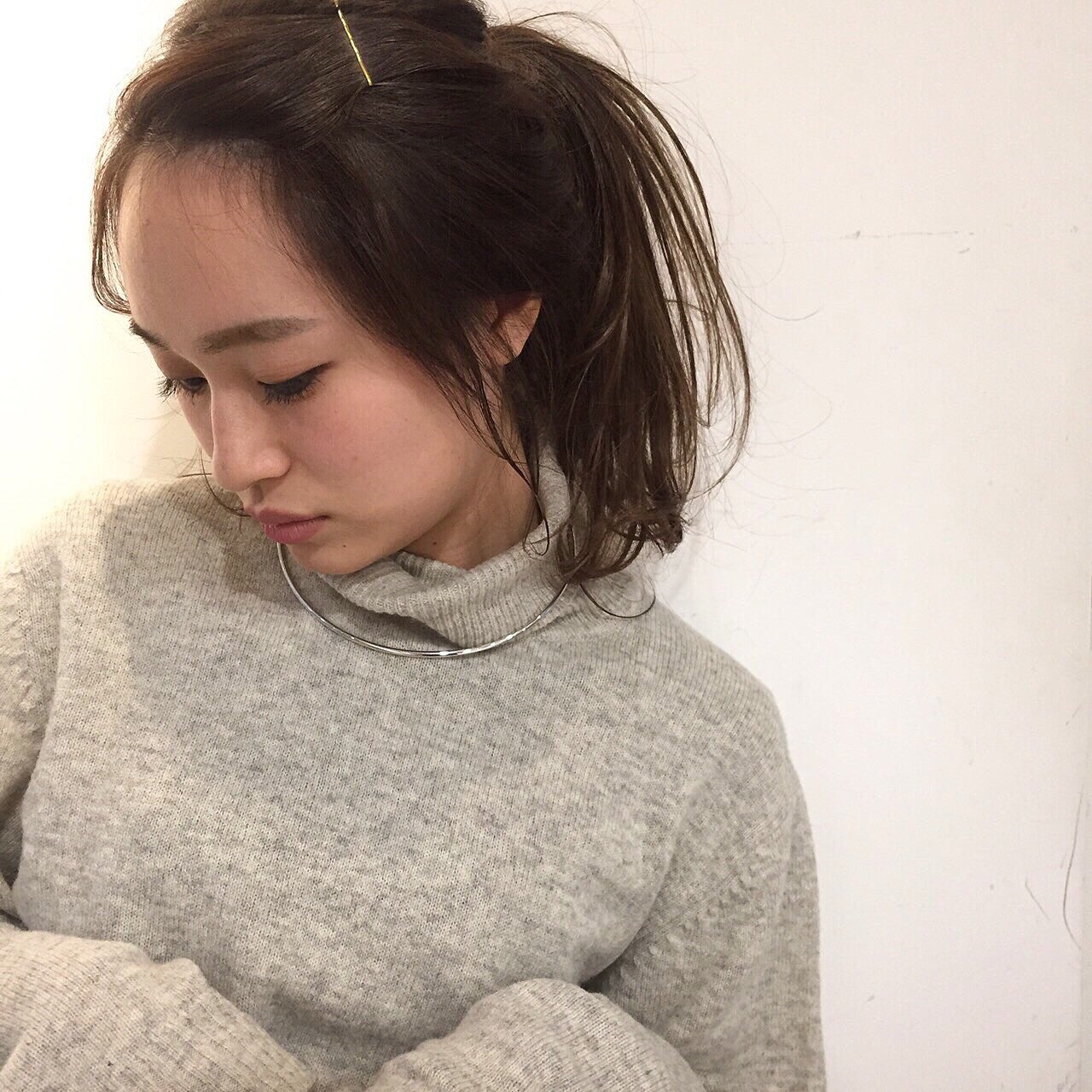サイドの髪を残してポニーテールに。ウェットなスタイリング剤をつけたサイドの髪を逆サイドにピンで留めるだけ!後れ毛は気にしないのがポイント♡