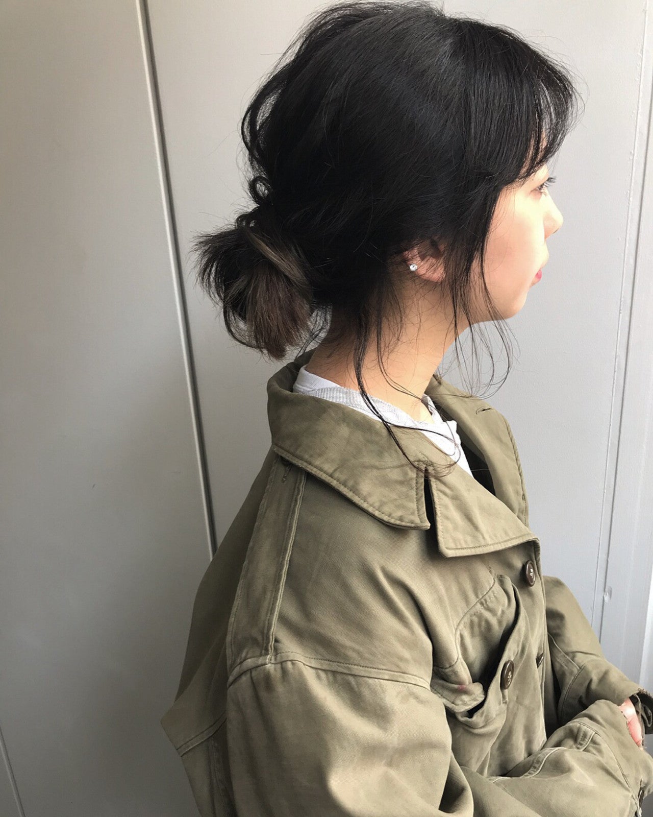 顔まわりの髪を残してお団子をつくるだけ!あえてルーズにまとめるのがポイント。