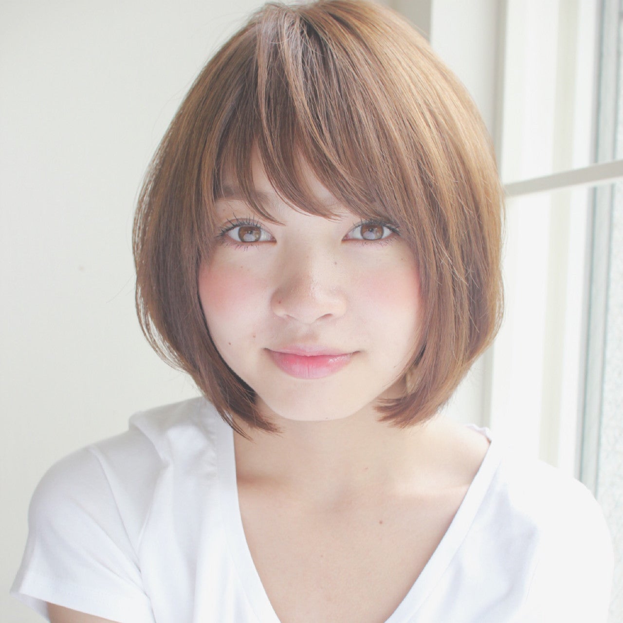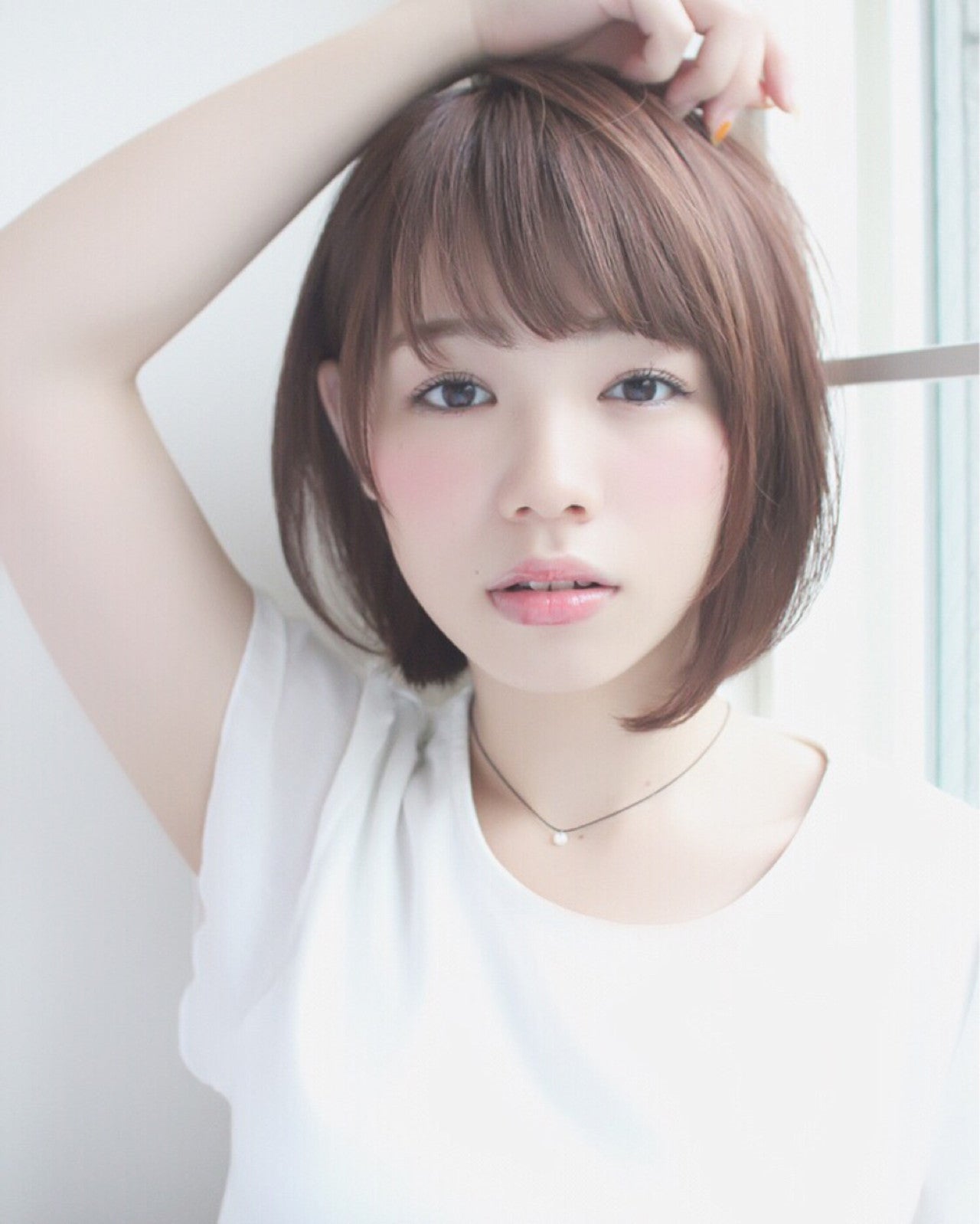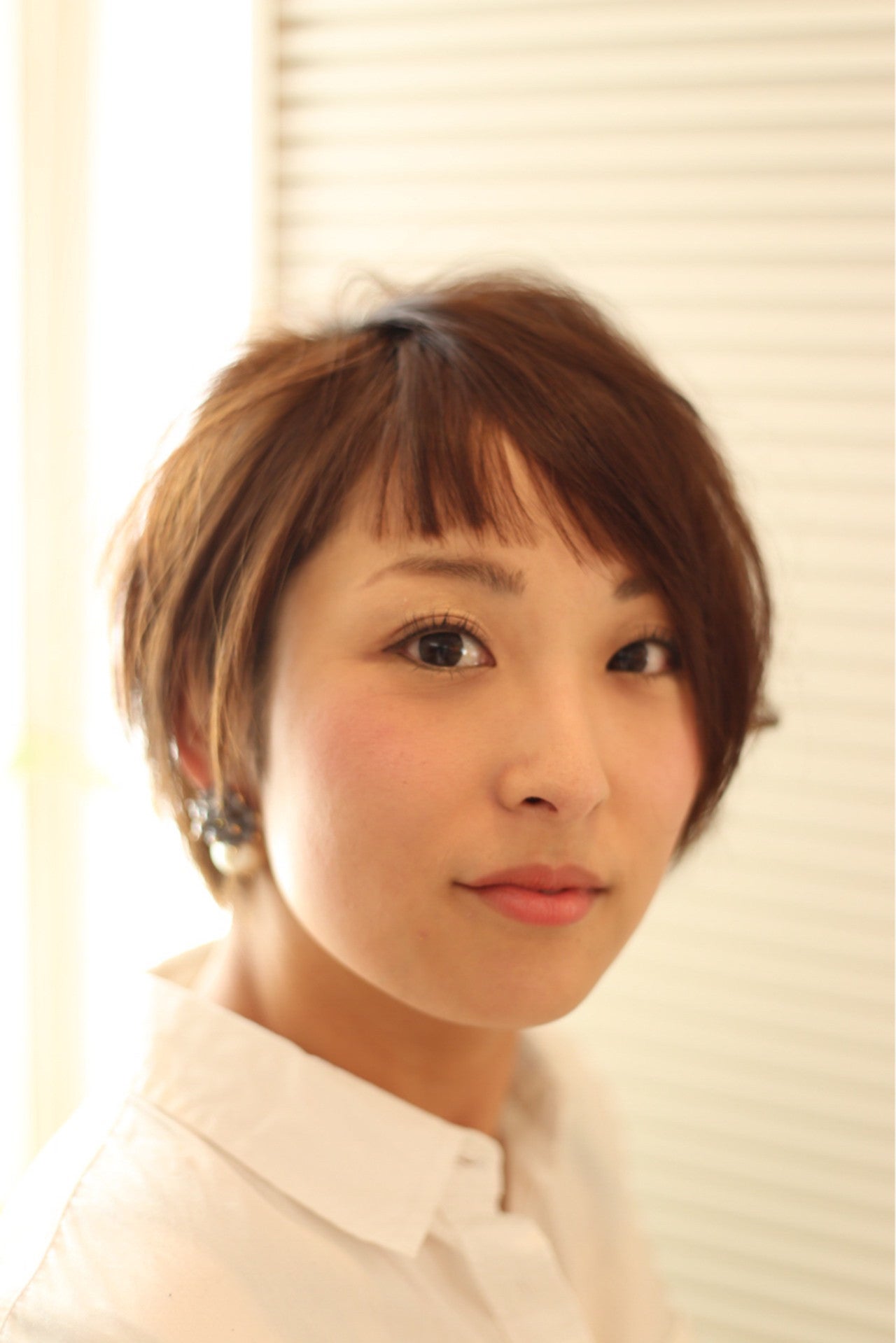 眉毛上の短め前髪がかわいい、ショートヘア。分け目を変えれば斜め前髪に変身できる、うれしいダブルバング!